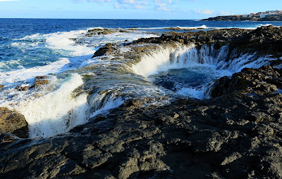 El bufadero de la Garita, Gran Canaria. Un bufadero, también llamado bufón, es es un fenómeno típico de las costas volcánicas, una formación geológica de morfología litoral en acantilados de origen cárstico o volcánico. Se trata de una chimenea natural abierta normalmente en un acantilado, que está comunicado con simas marinas, donde la fuerza de las olas genera movimientos caprichosos del agua debido a las grietas y oquedades que tienen las rocas. Y en ocasiones el movimiento de las olas y los recovecos de la piedra producen géiseres impresionantes.